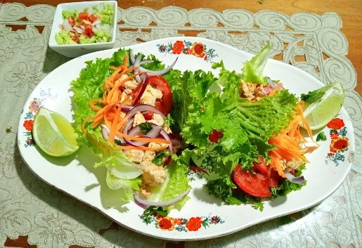 Orden de 3 tacos atún, lechuga, espinaca, pimiento verde, jitomate, cebolla, lechuga, zanahoria, pepino y cilantro.