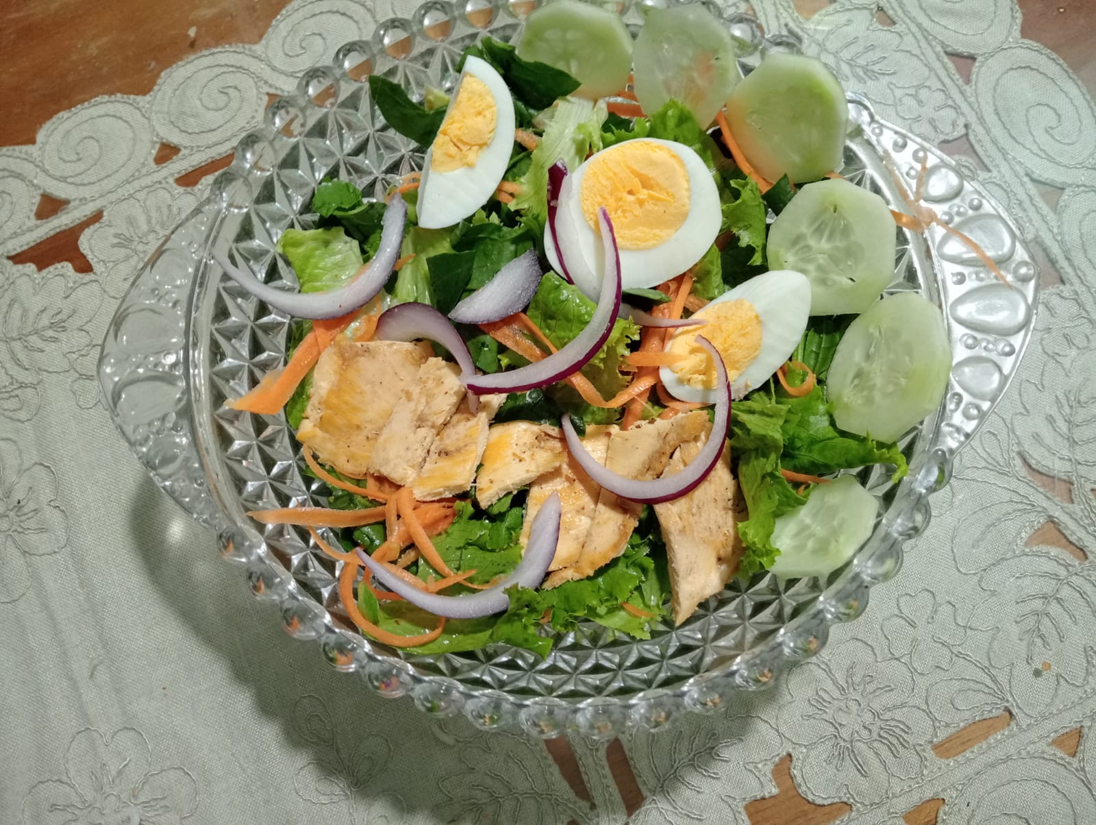 Pepino, cebolla morada, huevo cocido, lechuga, zanahoria, espinaca, pechuga de pollo.