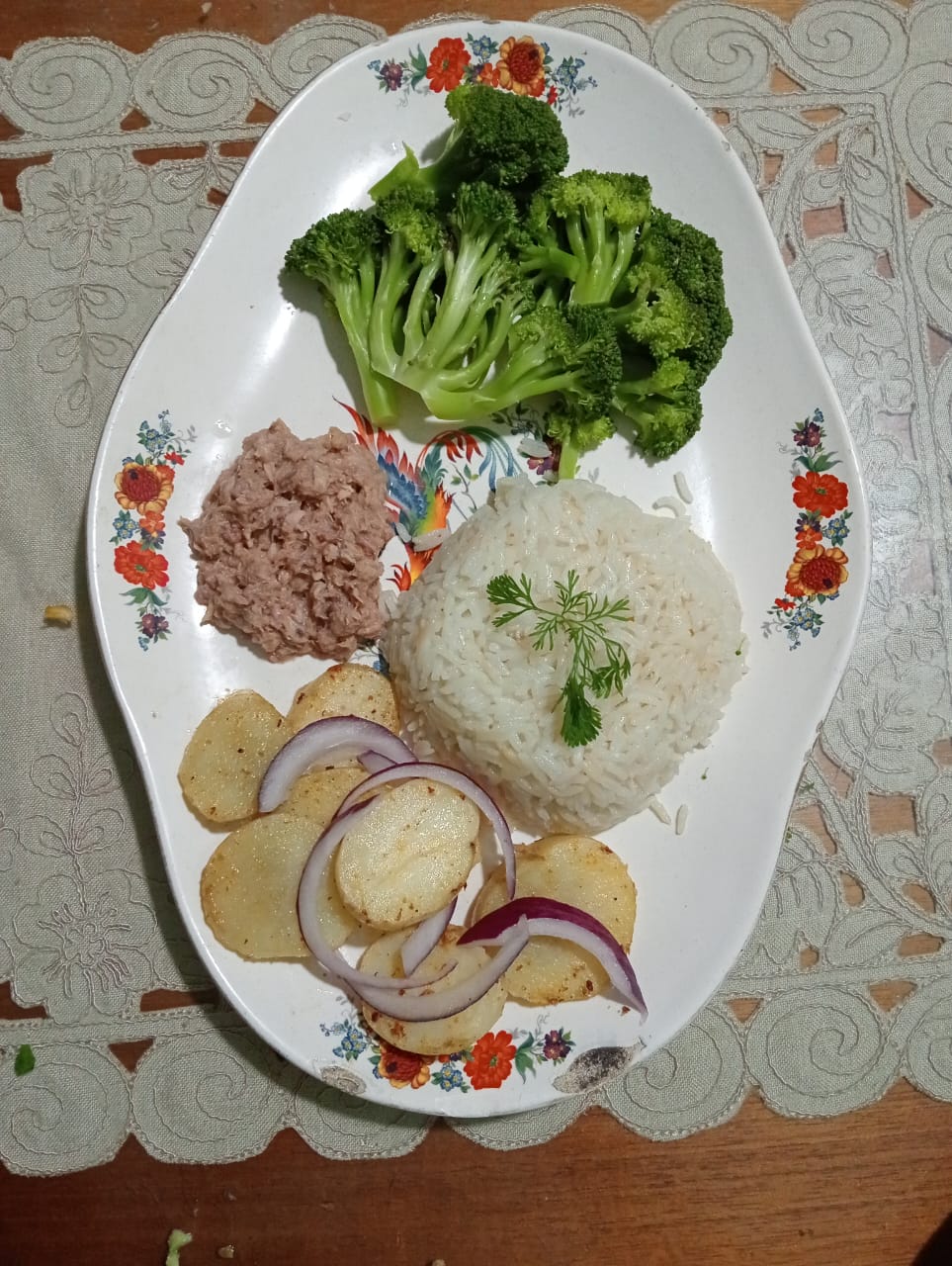 Arroz blanco, brócoli, atún, papas, cebolla morada y cilanmorada.
