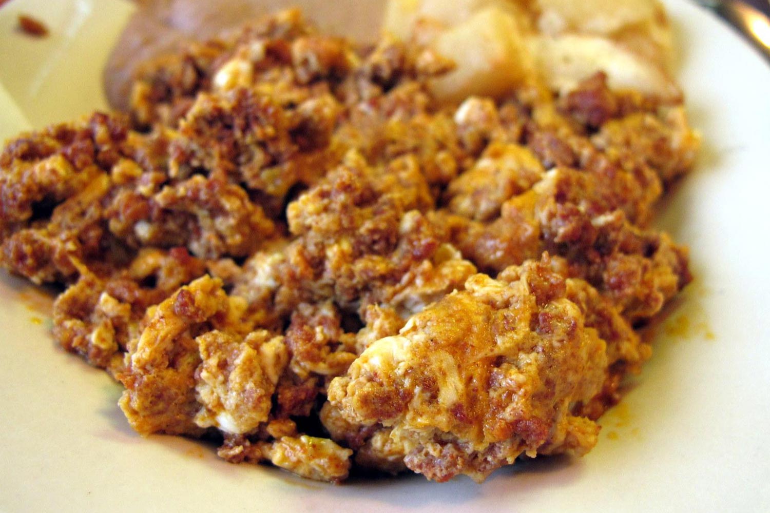Chilaquiles con totopos Crema y queso con carne de Bistec 200gr// Incluye fruta frijoles hervidos café 12oz y pan dulce (Porción personal)