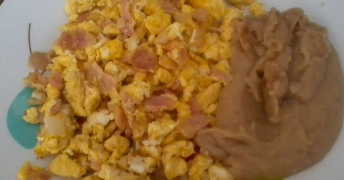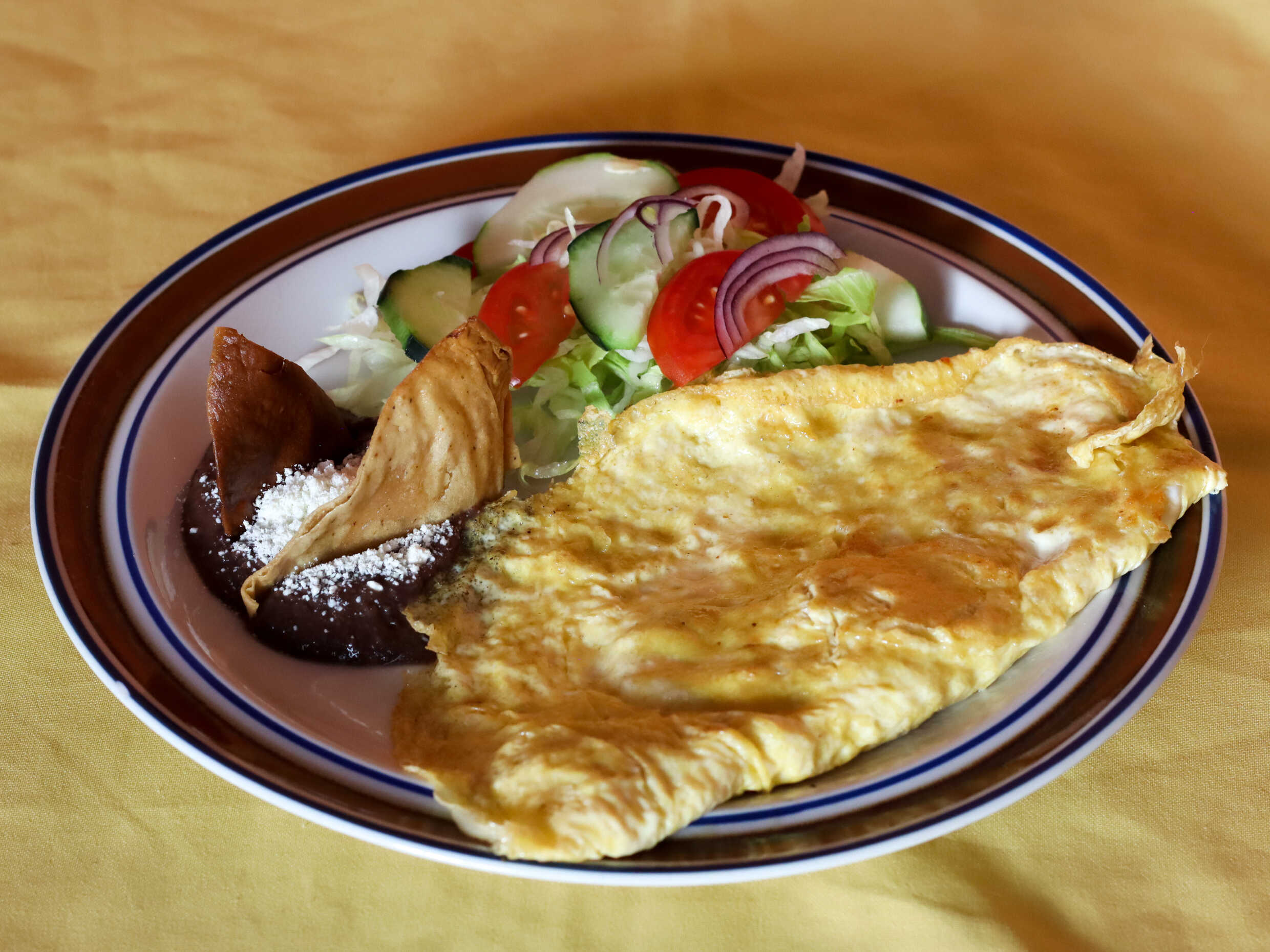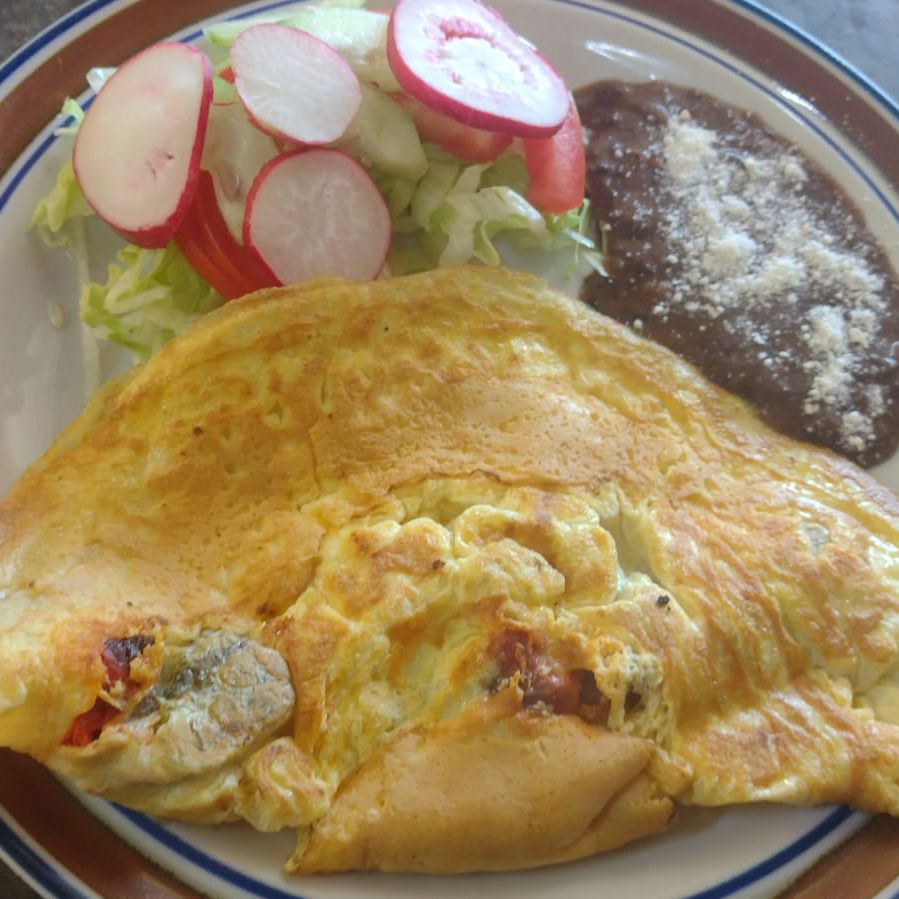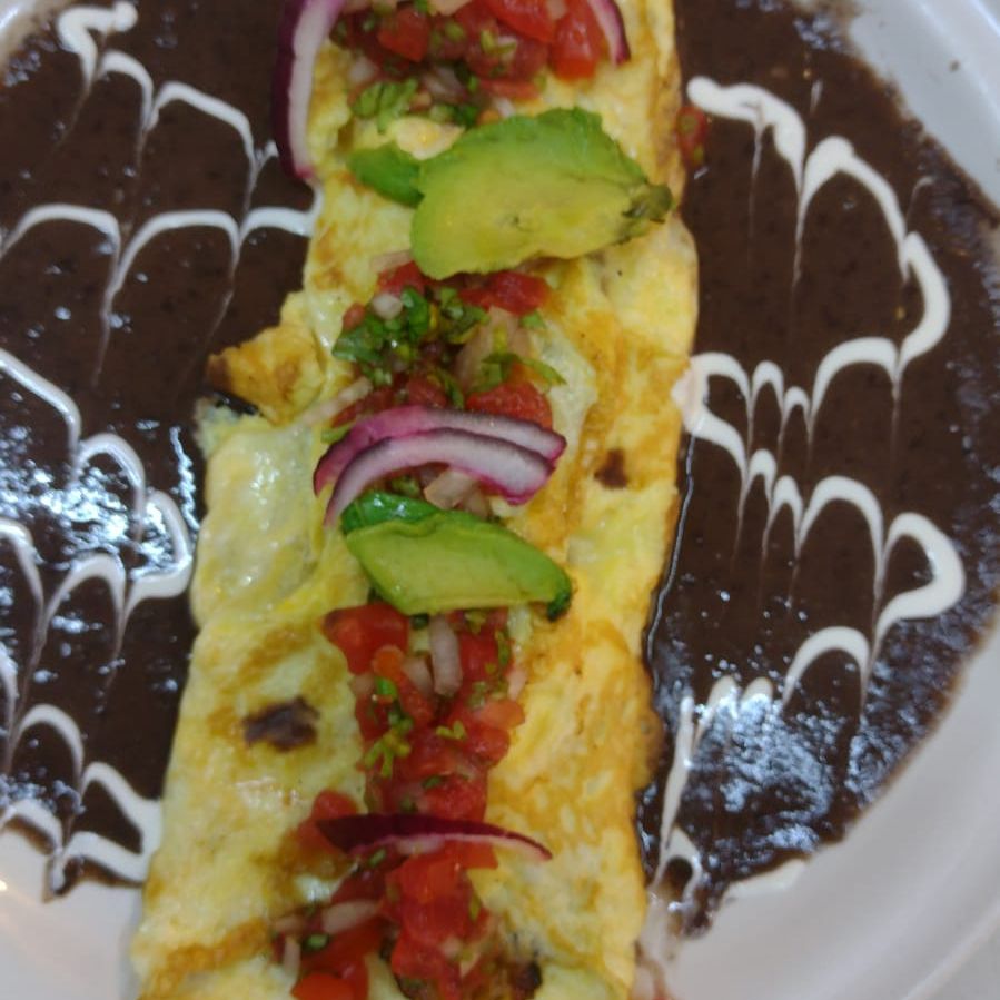 Incluye fruta, café y pan dulce., tortilla de huevo rellena de plátano frito y queso crema, bañada de frijoles caldositos y crema.