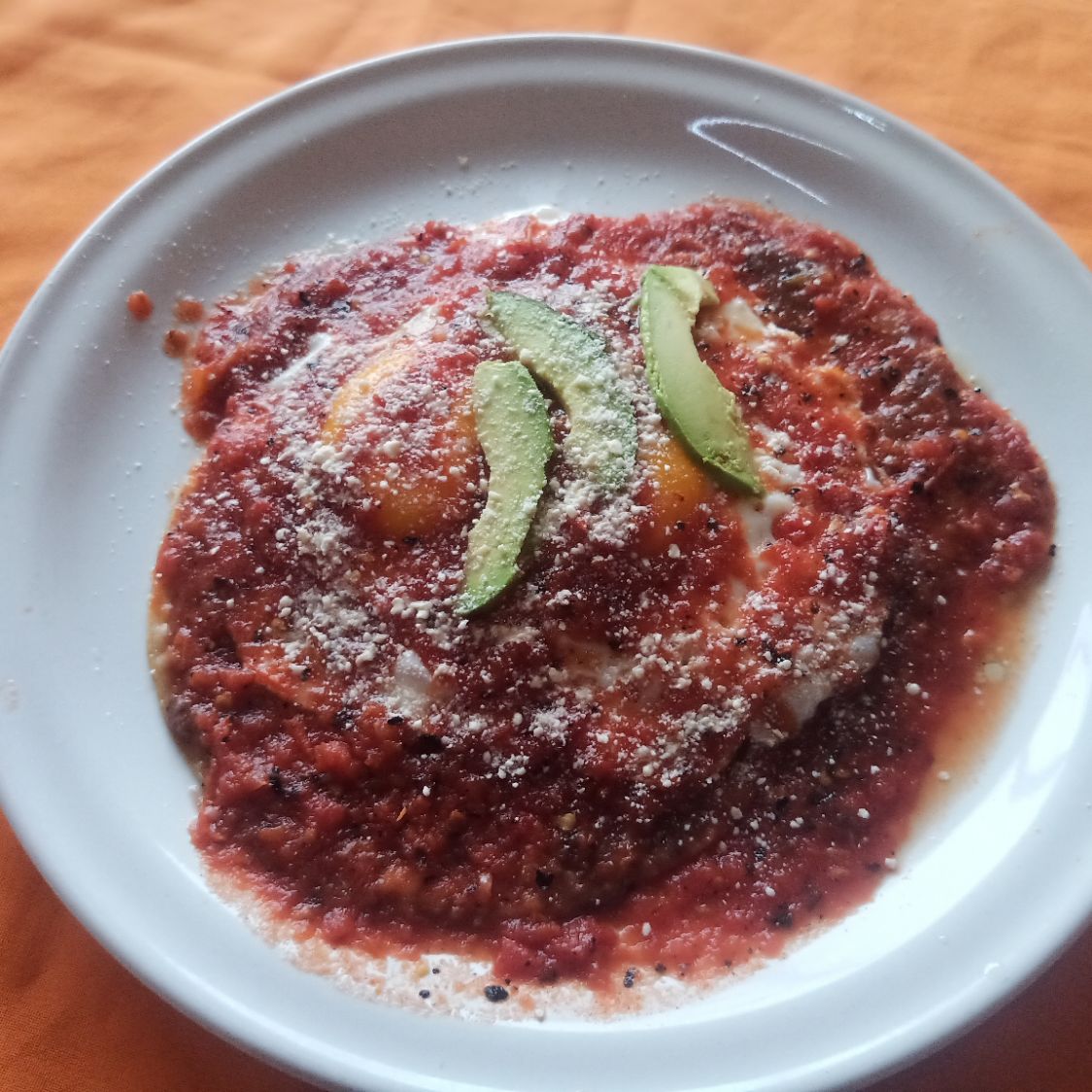 Champiñón, pimiento, jamón y queso bañado en salsa roja. Incluye fruta, café y pan dulce.