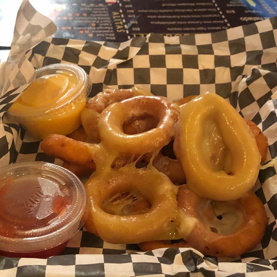 gratinados con queso gouda. incluye catsup y queso amarillo
