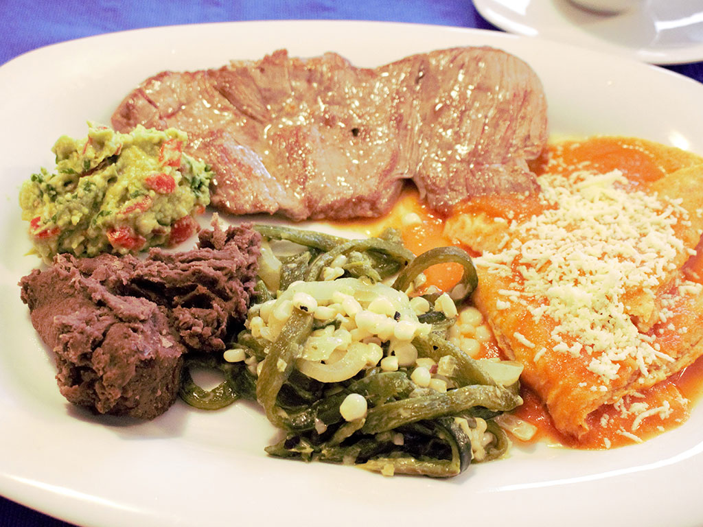 Suaves tiras de carne de res, cerdo o pollo acompañadas de dos enchiladas, papas fritas, plátanos fritos, ensalada sencilla y frijoles refritos.
