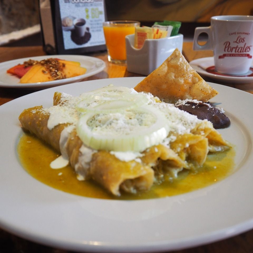 Cuatro enchiladas rojas o verdes con crema, queso cotija, cebolla, acompañadas con frijoles refritos, café negro, jugo de naranja pequeño 6 onzas, fruta en coctel con miel, granola y pan dulce.