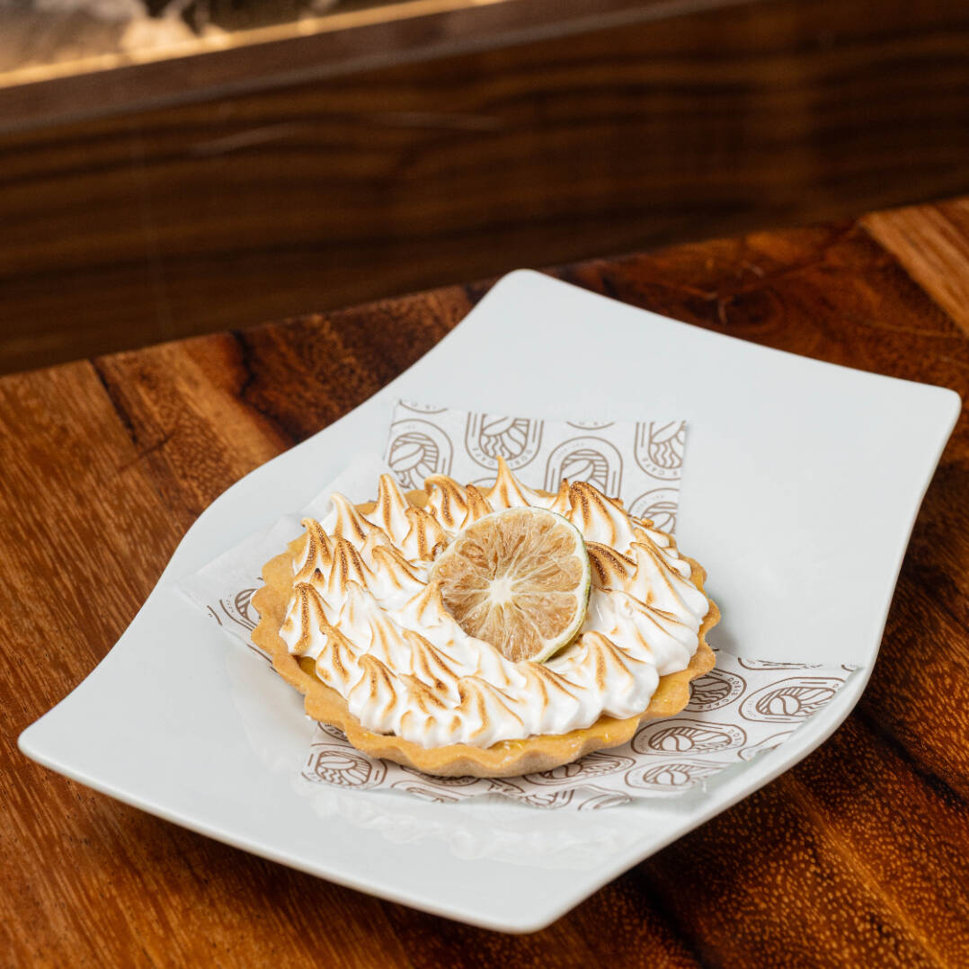 base crujiente de galleta dorada sostiene un relleno cremoso elaborado con jugo de limón natural, logrando un equilibrio perfecto entre dulzura y acidez. Coronado con merengue tostado, es un postre ligero, brillante y siempre bienvenido.