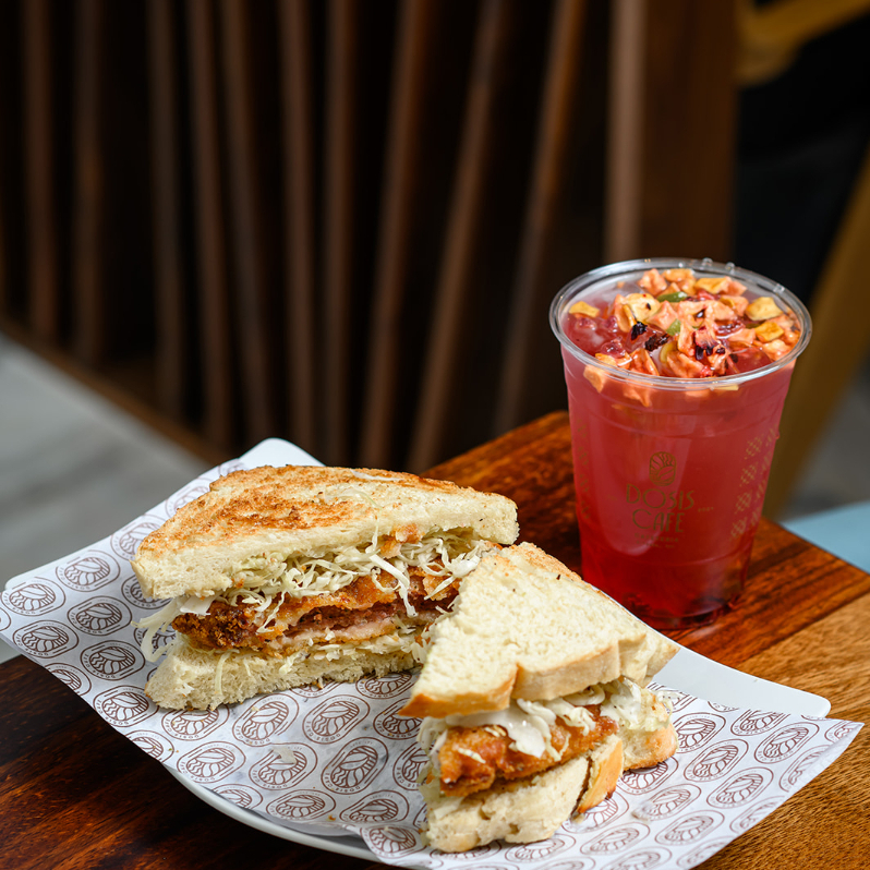 Crujiente filete de cerdo empanizado al estilo japonés, servido en pan blanco suave con ensalada fresca de col blanca y un toque de mostaza picante. Una combinación equilibrada entre textura, frescura y carácter