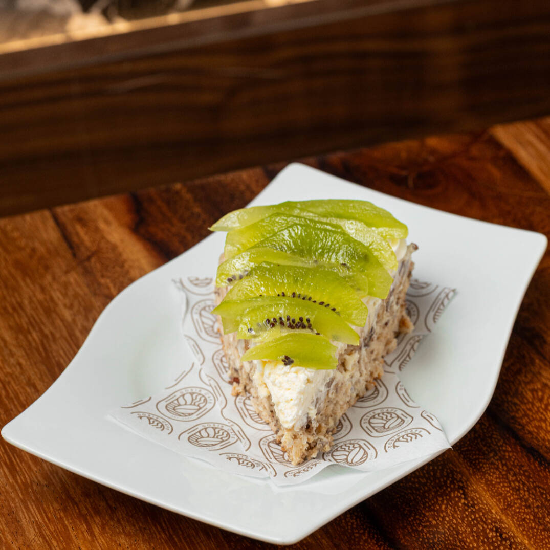 Base crujiente de merengue con nuez y galleta triturada, horneada hasta lograr una textura dorada y aireada. Se cubre con crema de queso suave y se decora con frutas frescas puede llevar fresa o kiwi.