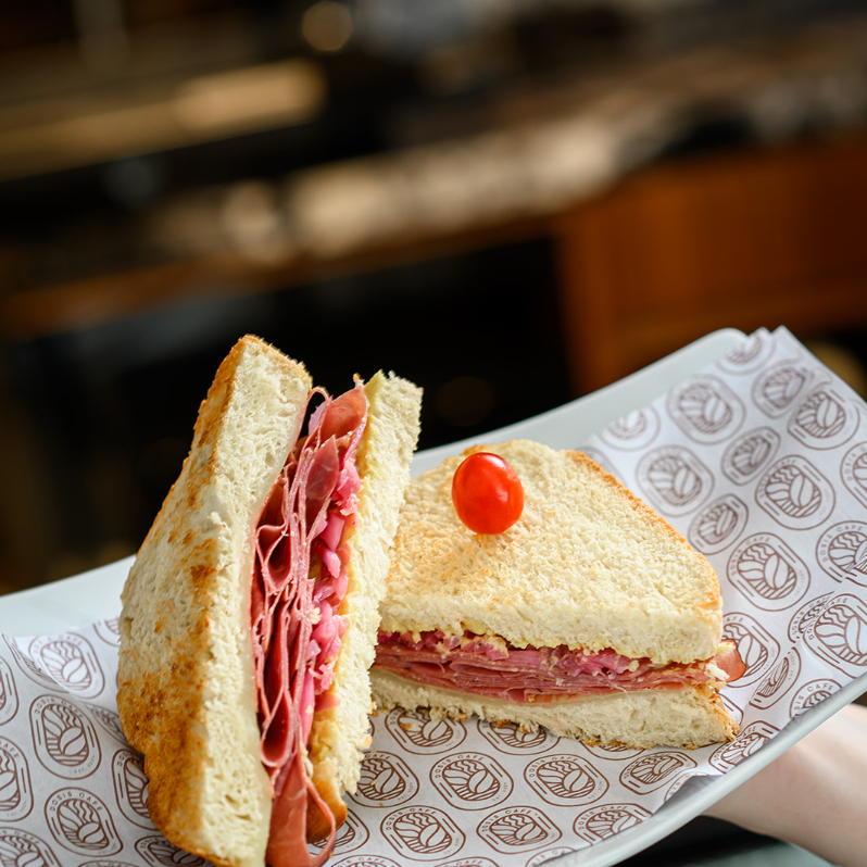 Una combinación fresca y sabrosa: jamón de pavo en rebanadas delgadas, untado con pesto de albahaca casero, acompañado de queso manchego fundente, lechuga crujiente y jitomate maduro. Todo entre pan artesanal ligeramente tostado, que realza los aromas herbales y la suavidad del relleno.