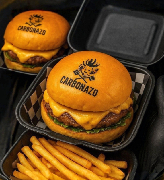 Pan brioche , 150 gr de carne de res, queso, lechuga, jitomate, cebolla, catsup y mostaza.