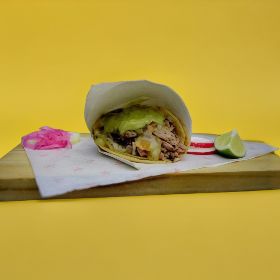 Mayonesa, frijoles, carne oriental o pastor, queso manchego, guacamole, cilantro y cebolla.
