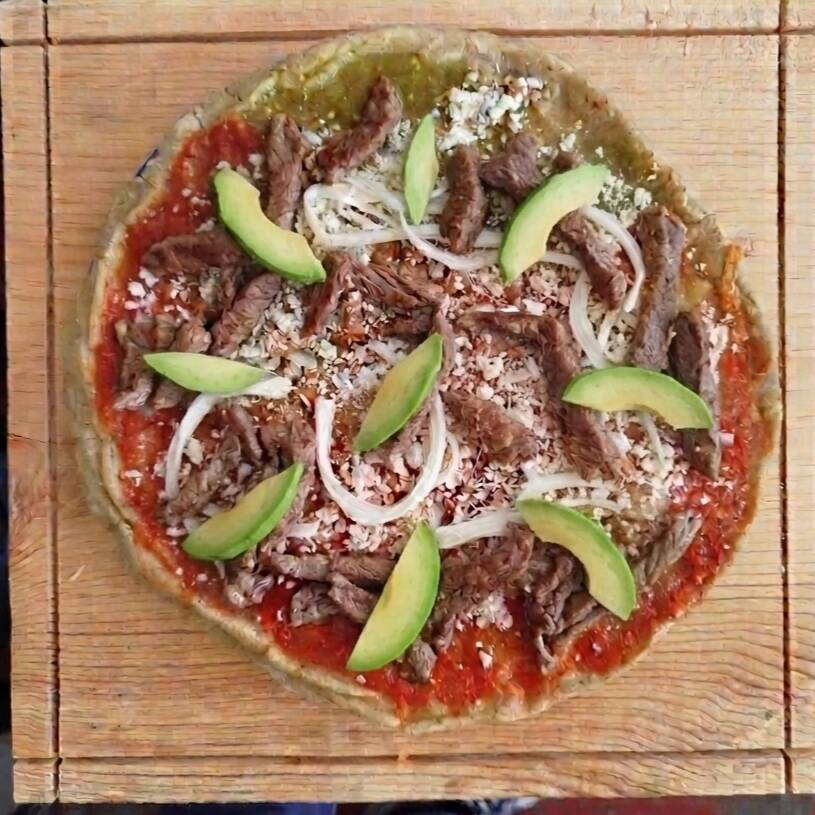 Base de masa de maíz doblada con queso de hebra, mantequitas, salsa, cebolla y bistec