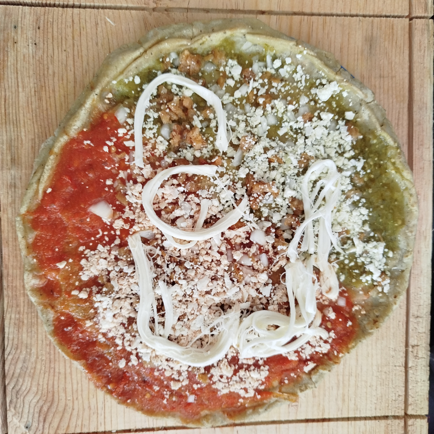Base de masa de maíz alargada doblada con queso de hebra, salsa, mantequitas, cebolla y champiñones
