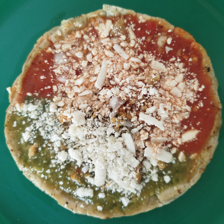 Base de masa de maíz alargada rellena con frijol, incluye salsa, cebolla y mantequitas