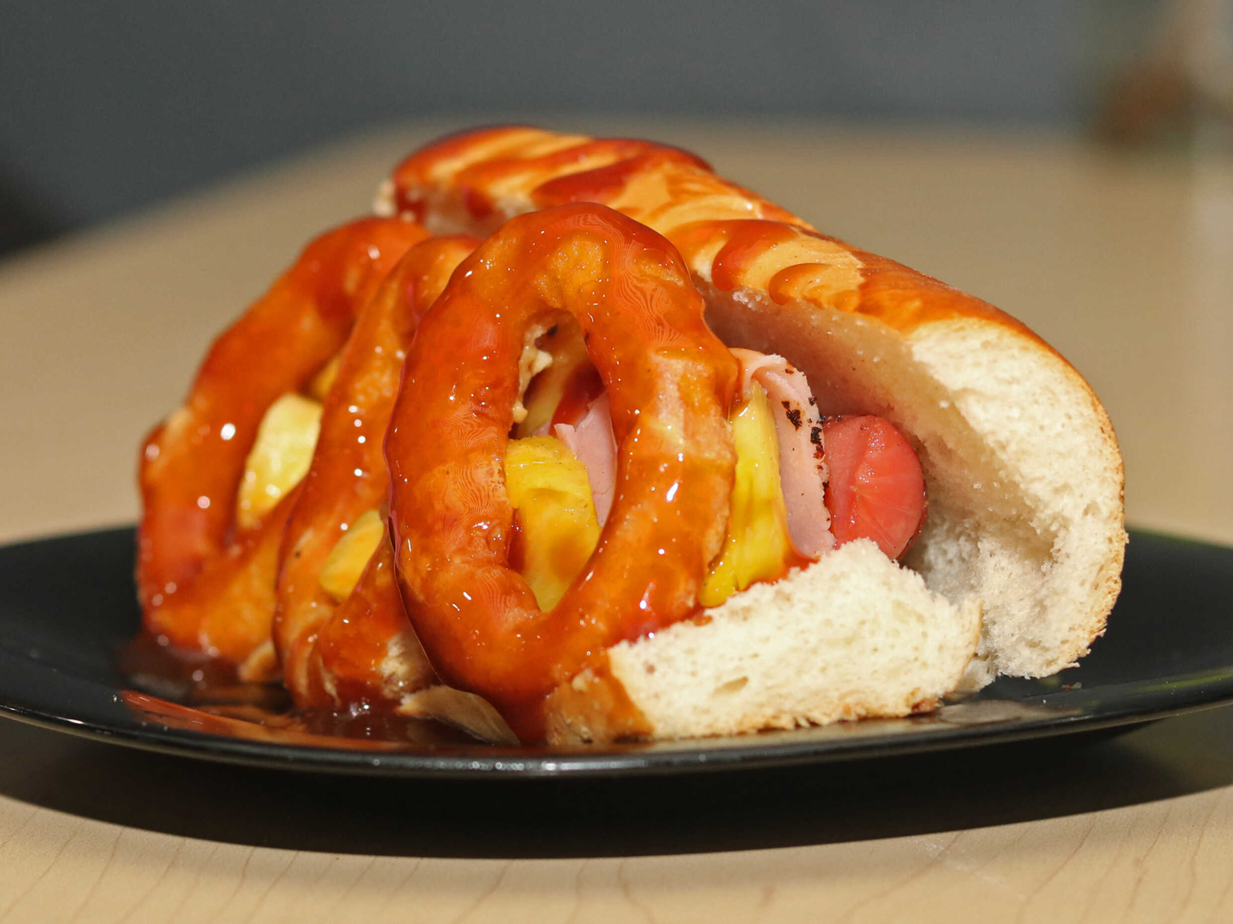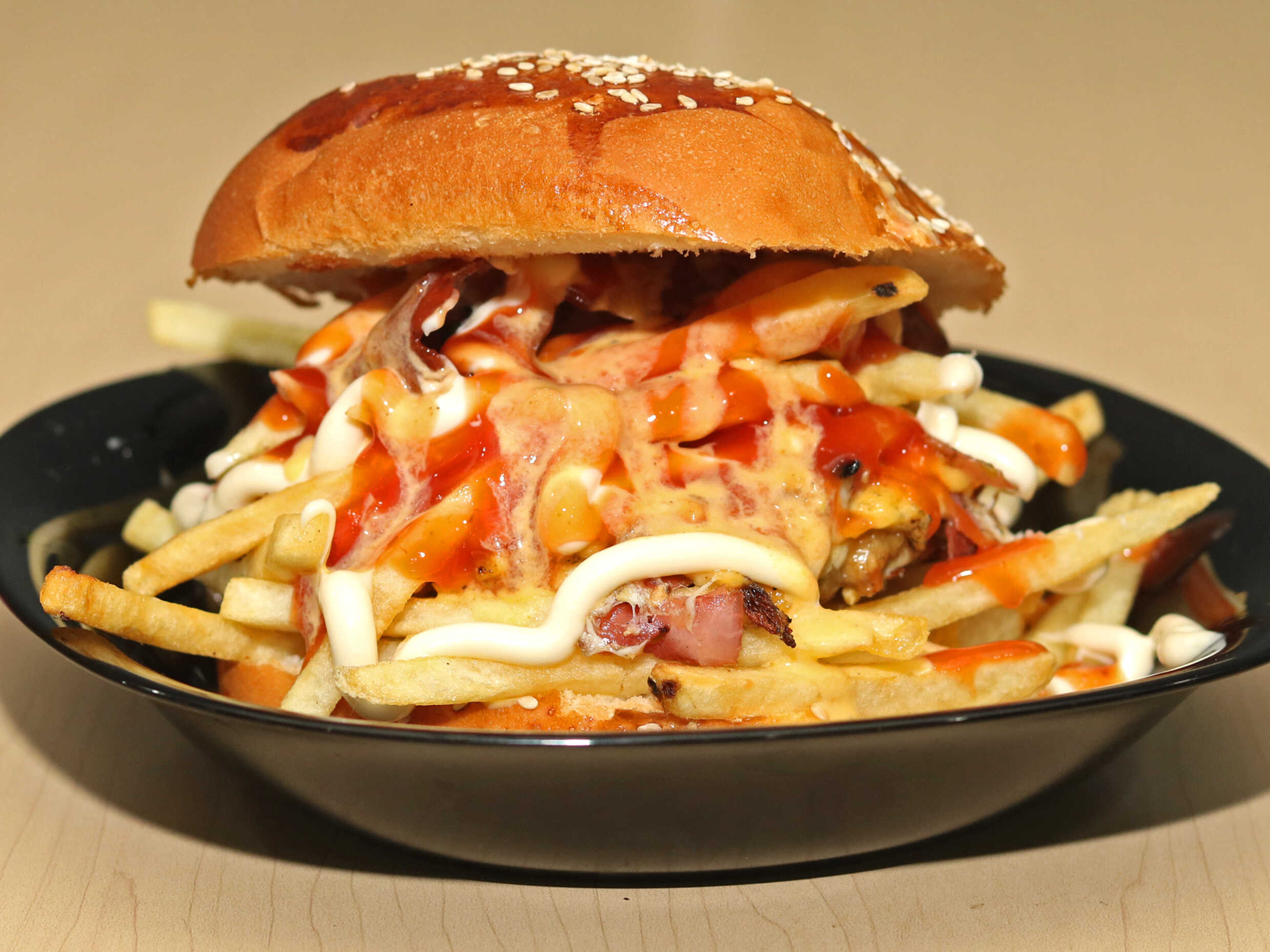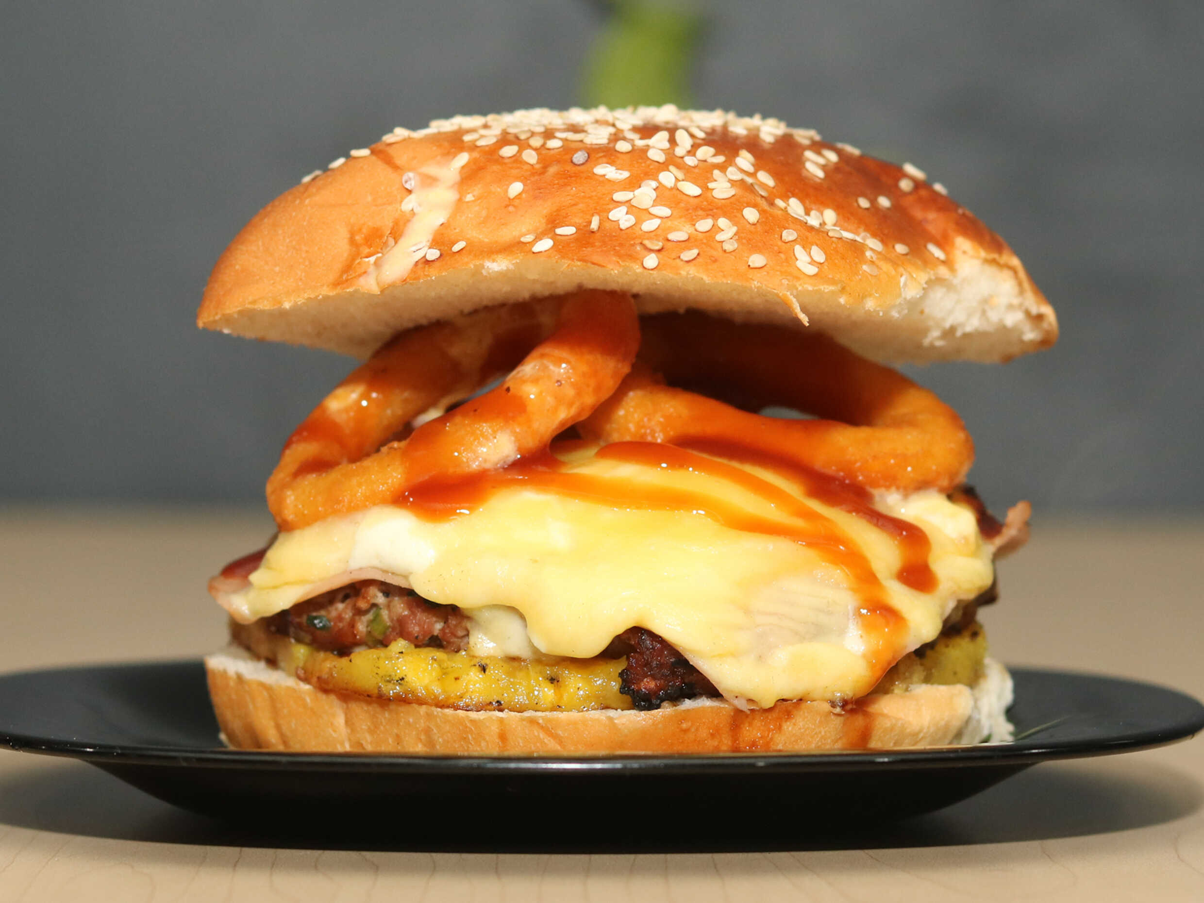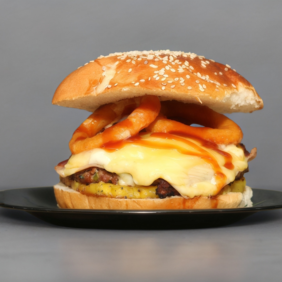 Bollo de panaderia, 150gr de carne de res casera, queso Oaxaca, gouda y amarillo. Además de, jamón Virginia, piña natural asada, cebolla asada y aderezo agridulce.