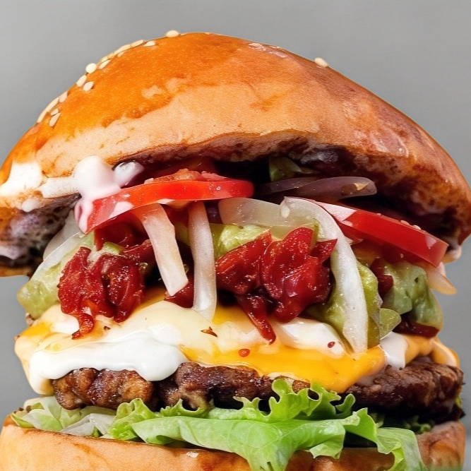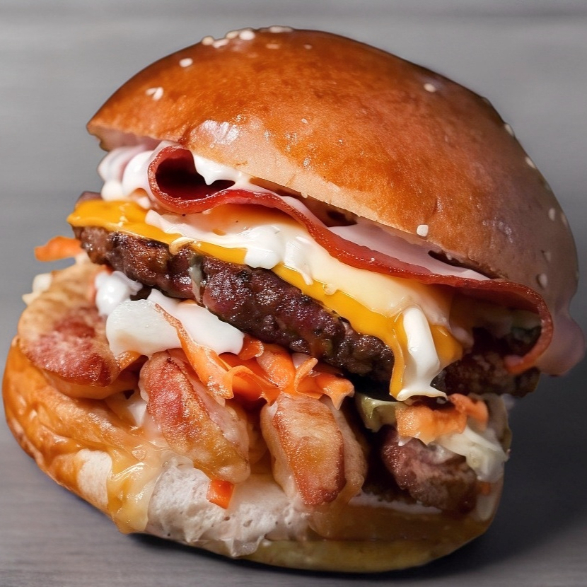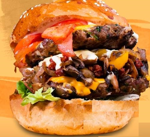 Bollo de panaderia, 150gr de carne de res casera, queso amarillo. Como su nombre lo dice, está hamburguesa tiene doble carne, doble queso, doble tocino, ¡Doble de todo!