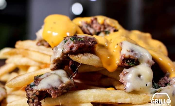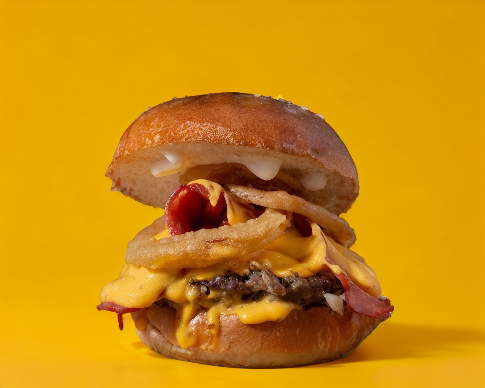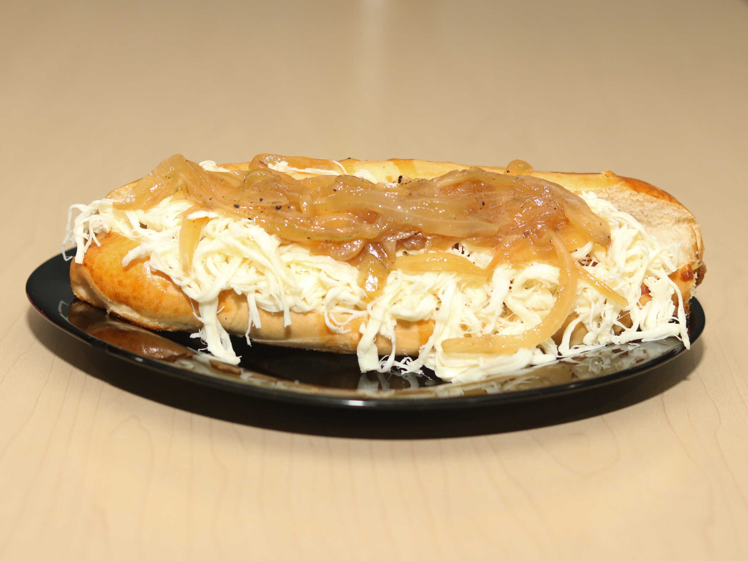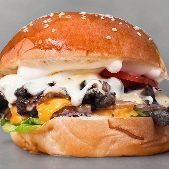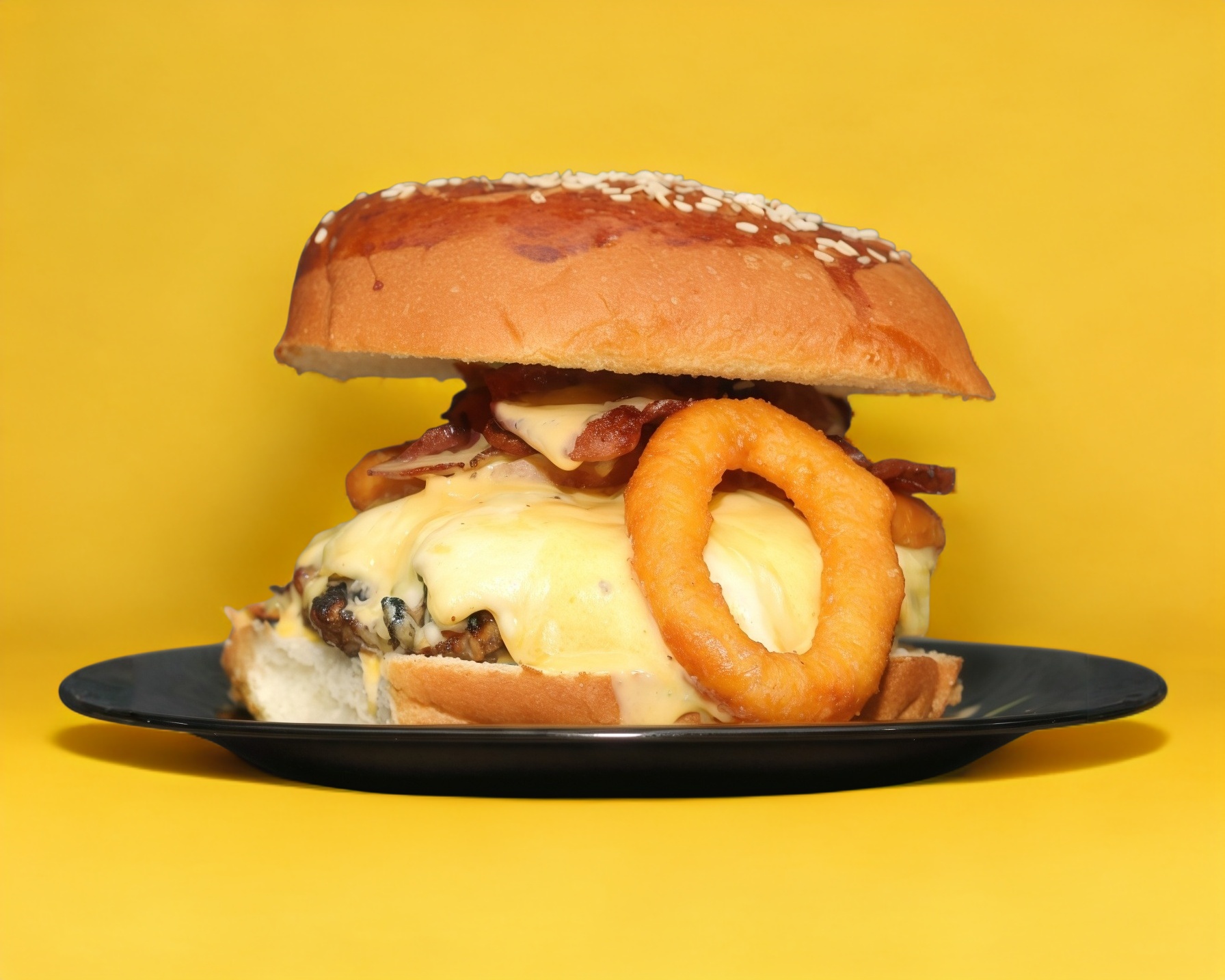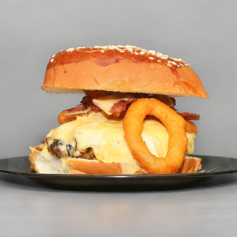 Bollo de panaderia, 150gr de carne de res casera, queso Oaxaca, gouda y amarillo. Además de doble de los 3 quesos, cebolla asada y salsa de queso cheddar.