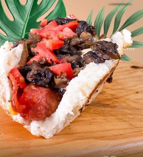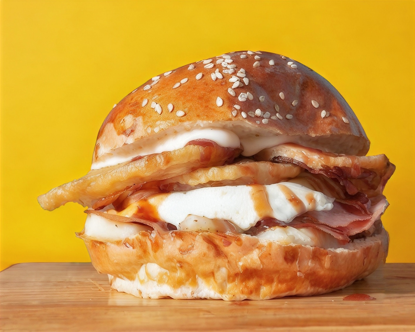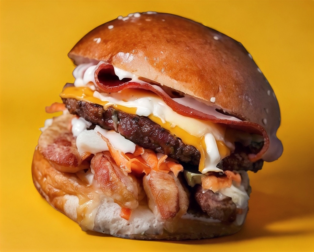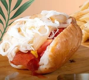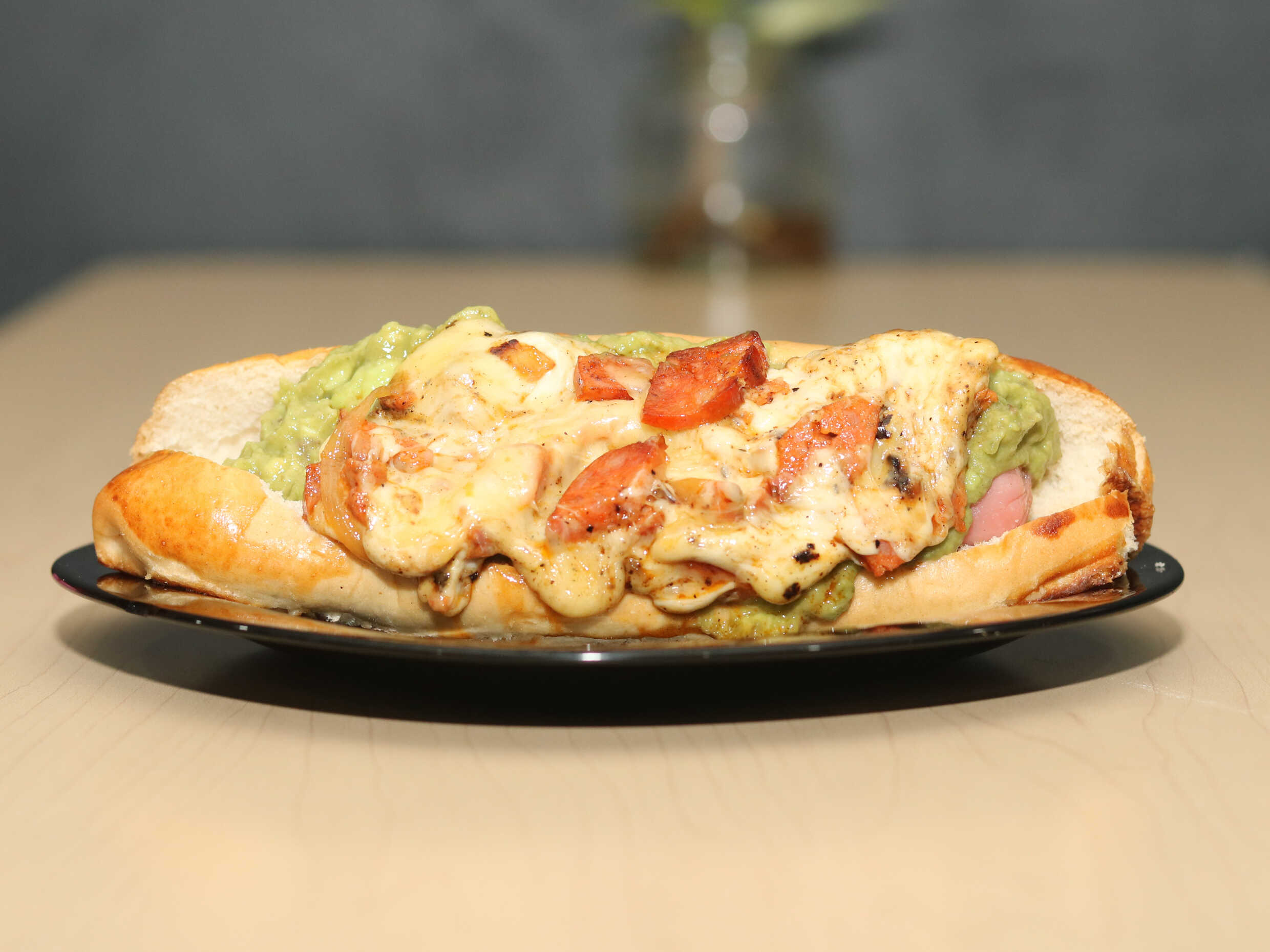 Bollo de panaderia, 150gr de carne de res casera, queso Oaxaca, gouda y amarillo. Además de ensalada alemana, tocino y salchicha rebosada.