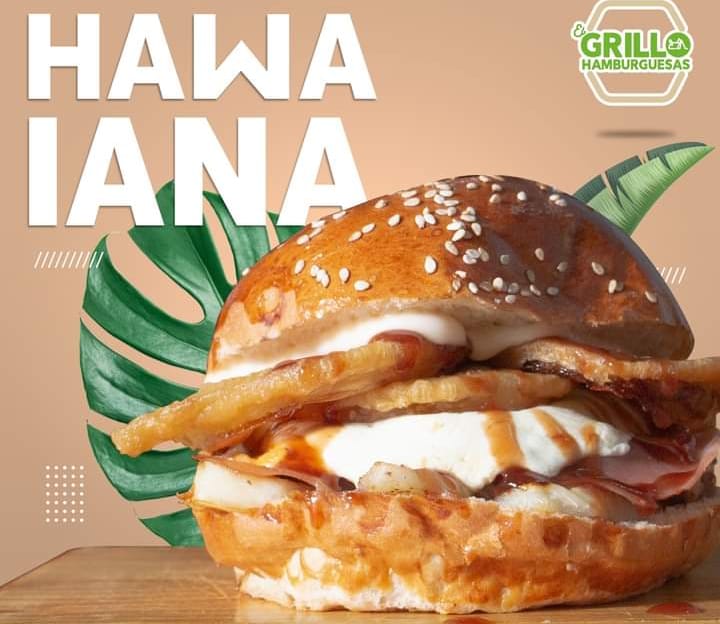 Bollo de panaderia, 180gr de sirloin, con el toque de la casa, queso cheddar, tocino ahumado y mayonesa. Además de piña natural asada, aros de cebolla, Jamon de pierna y nuestro aderezo agridulce.