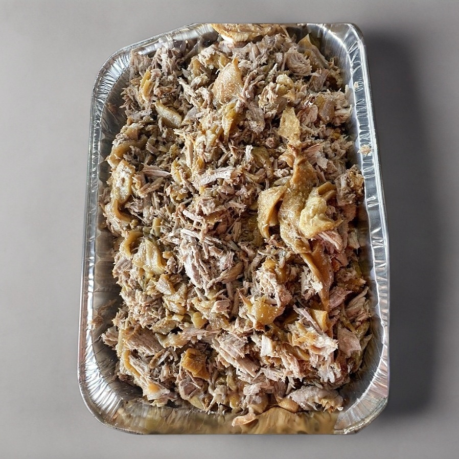 3/4 Carnitas, 8 pz tacos dorados, 1 1/2 orden de chicharrón, 1/2 tortillas