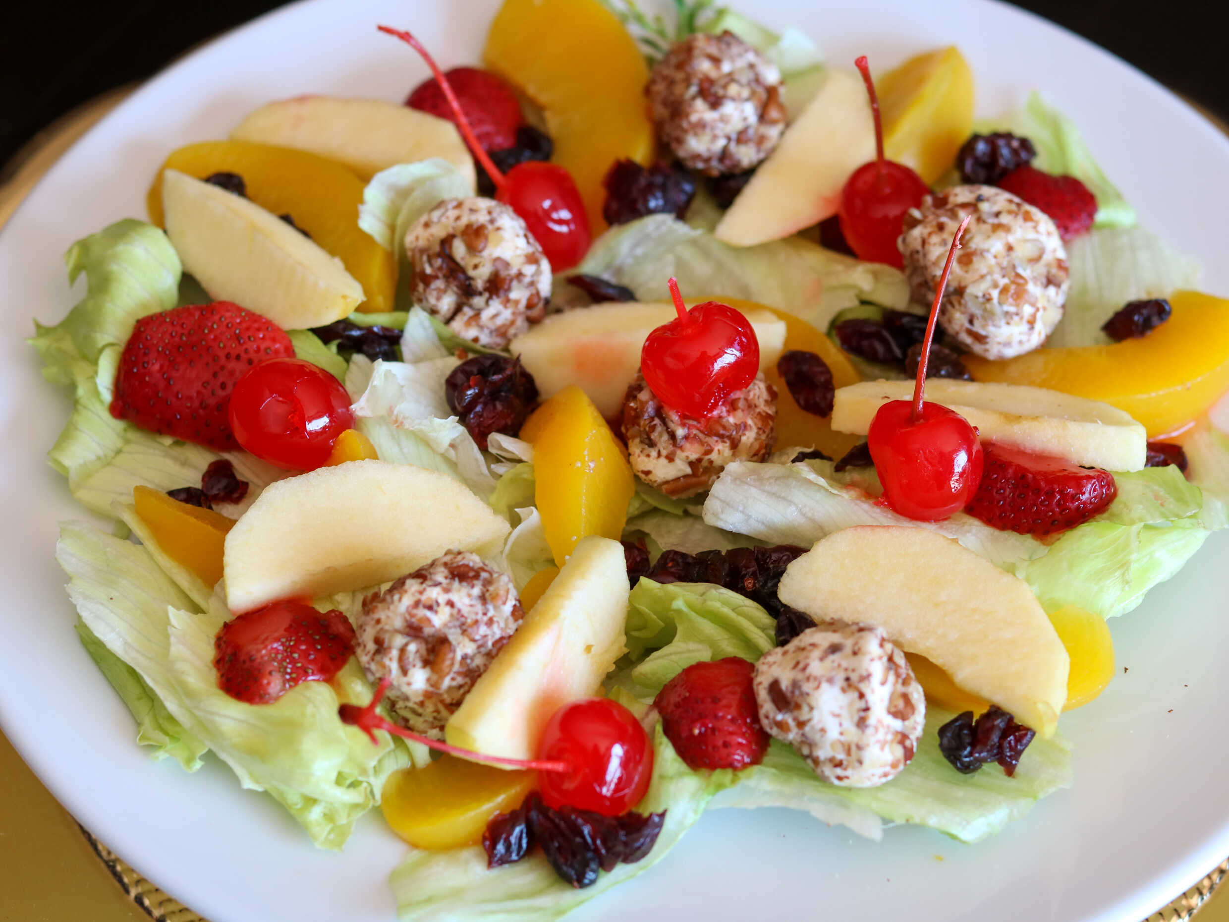 Lechuga, manzana, durazno, frutos rojos, nuez y queso Philadelphia.