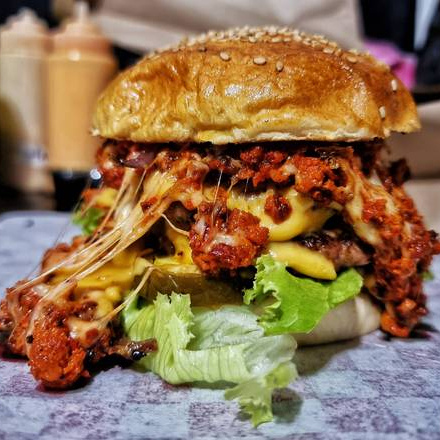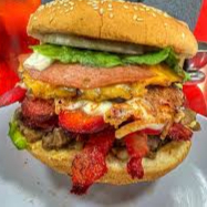 Dos jugosas carnes a la plancha complementadas con doble tocino, queso oaxaca x2, queso americano x2, lechuga, jitomate, cebolla, aderezos liquidos.