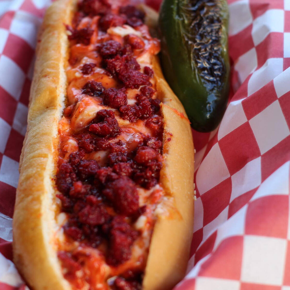Deliciosa salchicha frita con tocino, jamón, chorizo y queso Oaxaca fundido, jitomate, cebolla, aderezos liquidos.