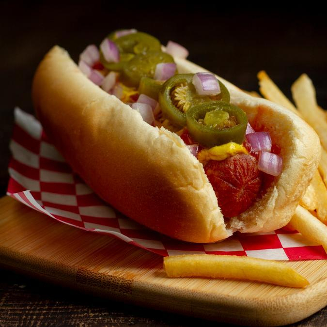 Deliciosa salchicha frita con tocino, jitomate, cebolla, aderezos liquidos.