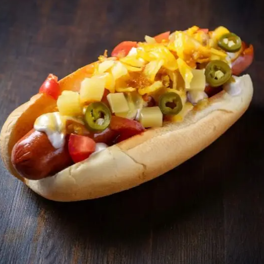 Deliciosa salchicha ftrita con tocino, jamón, piña natural asada en trocitos, queso oaxaca, jitomate, cebolla, aderezos liguidos.