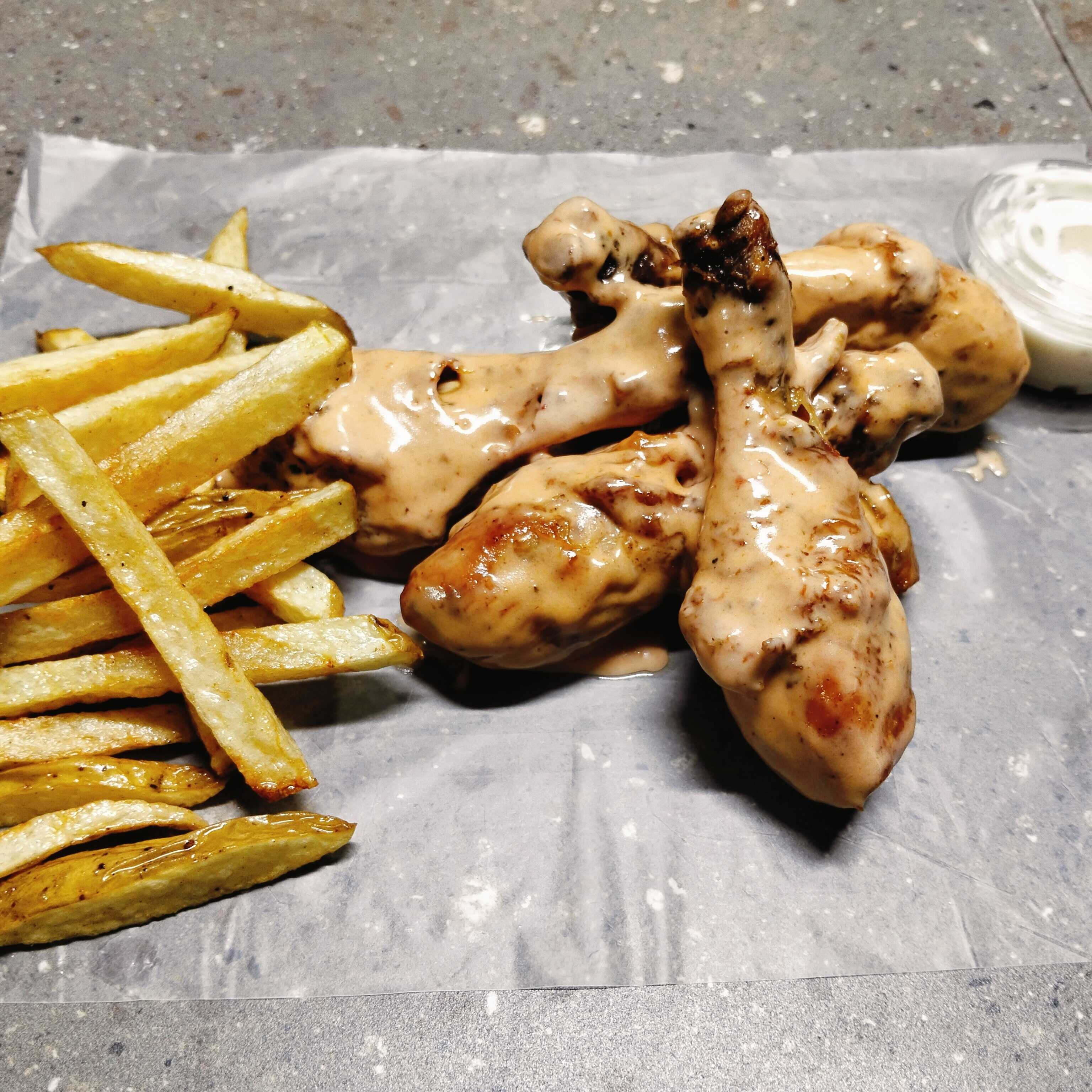 6 piernas de pollo fritas bañadas con la salsa de tu preferencia acompañadas con ranch y papas fritas.