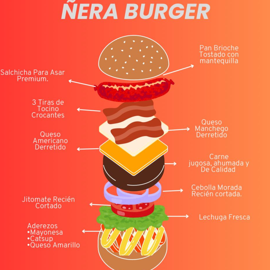 Carne sirloin, queso manchego, queso de hebra, queso americano, extra de tocino, lechuga, cebolla, jitomate, salsa de tomate, mayonesa y queso amarillo.