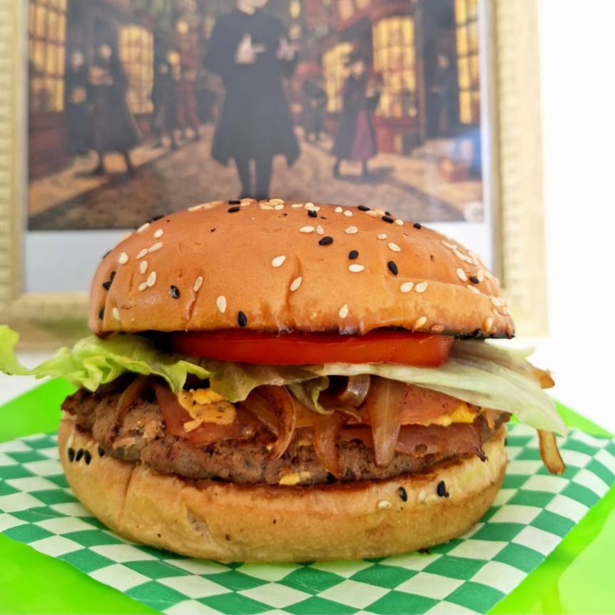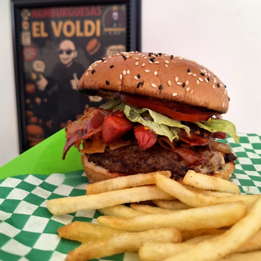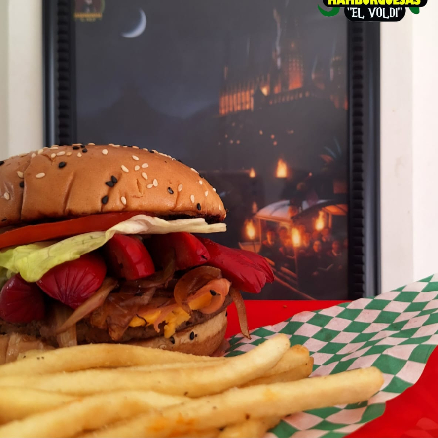120 g De carne, jamón, queso americano, cebolla caramelizada con trocitos de tocino y jamón, vegetales y aderezos, sin papas.