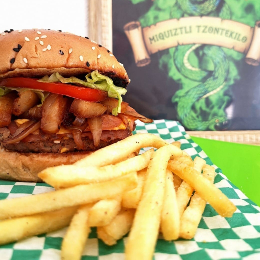 150 g De carne rellena de queso manchego, tiras crocantes de tocino, salchicha polaca, salsa macha de café, jamón, queso americano, cebolla caramelizada con trocitos de tocino y jamón, vegetales y aderezos, incluye porción de papas a la francesa.