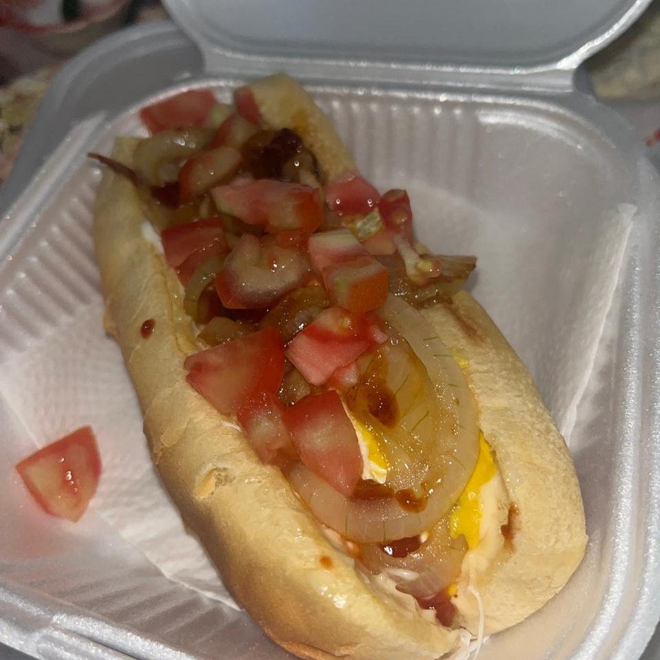 Con su rico pan, salchicha enrollada de tocino, capsut, mostaza, tomate, cebolla y rico queso de hebra