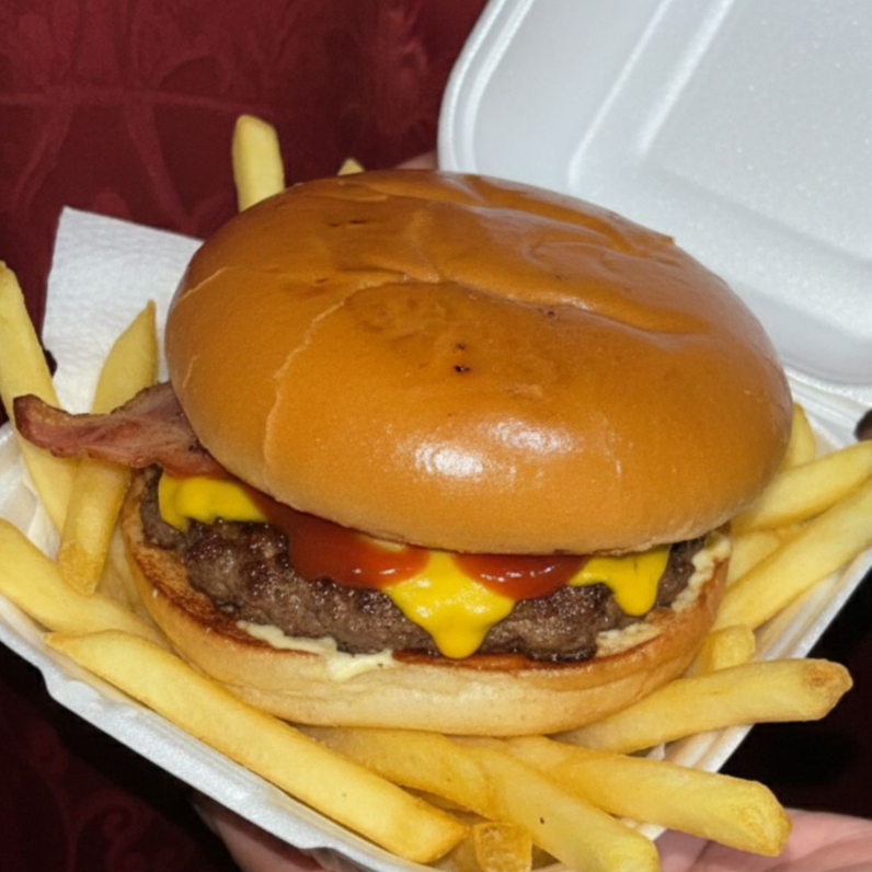Rica hamburguesa con papas (90g) aprox, con su rica carne sabor BBQ, mayonesa, capsut, mostaza, queso amarillo, salchicha, tocino y sus ricas papas a la francesa
