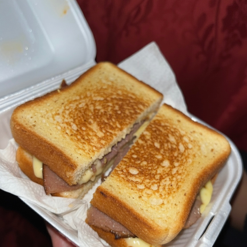Rico sandwich, calientito con su queso amarillo, queso de hebra, queso manchego, jamón