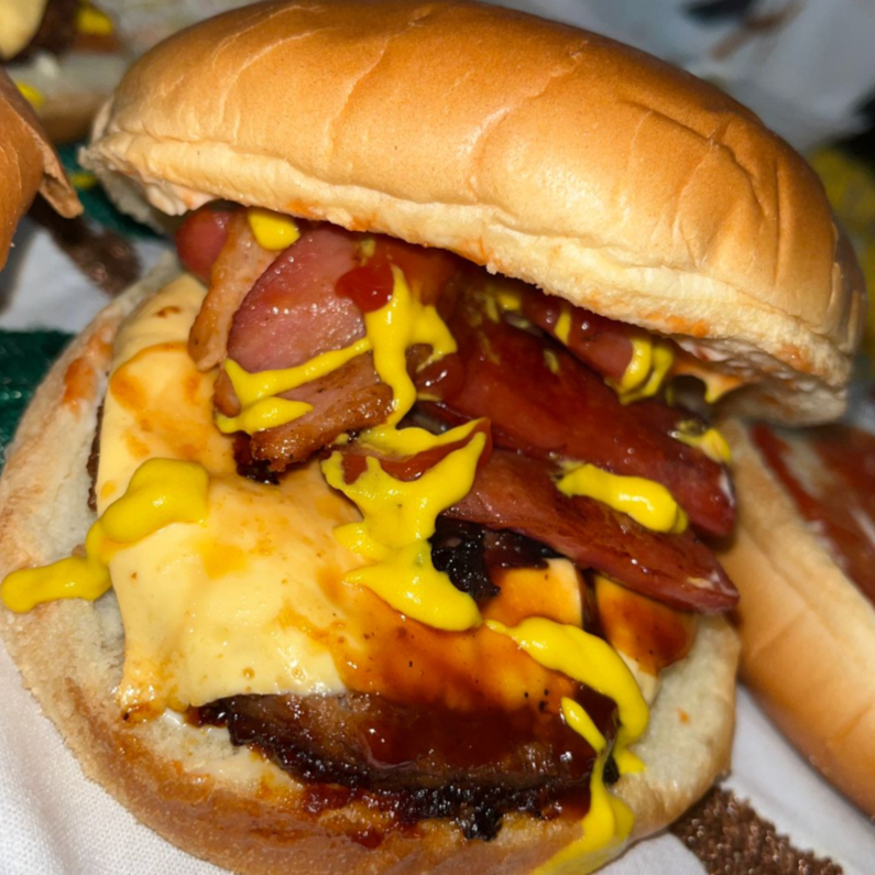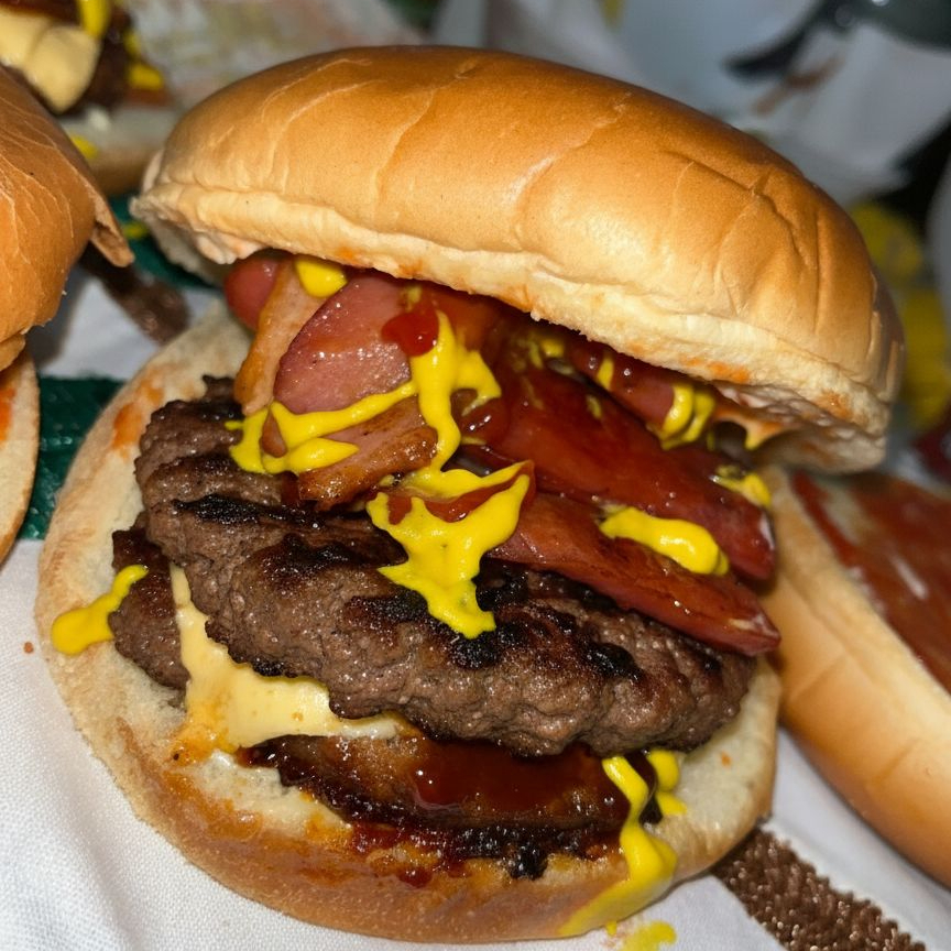 Hamburguesa con rico pan, carne, BBQ, Tocino, Salchicha, Mostaza, Catsup, Queso amarillo, Mayonesa