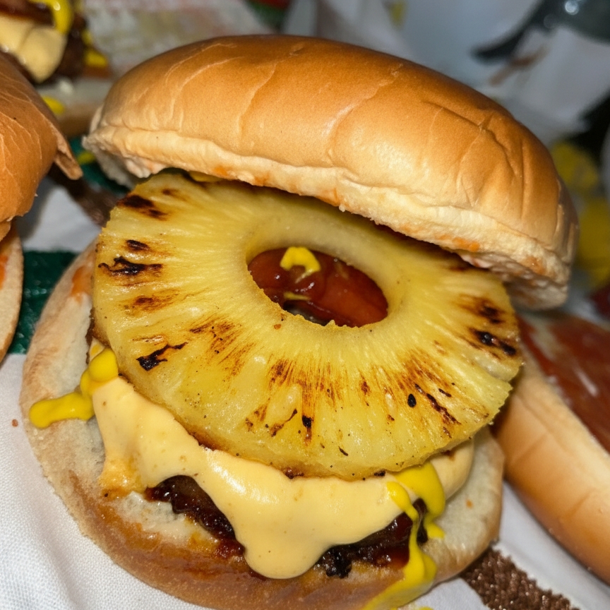 Hamburguesa con rico pan, carne, BBQ, Tocino, Salchicha, Mostaza, Catsup, Mayonesa, queso de hebra, jitomate y su rica rebanada de piña
