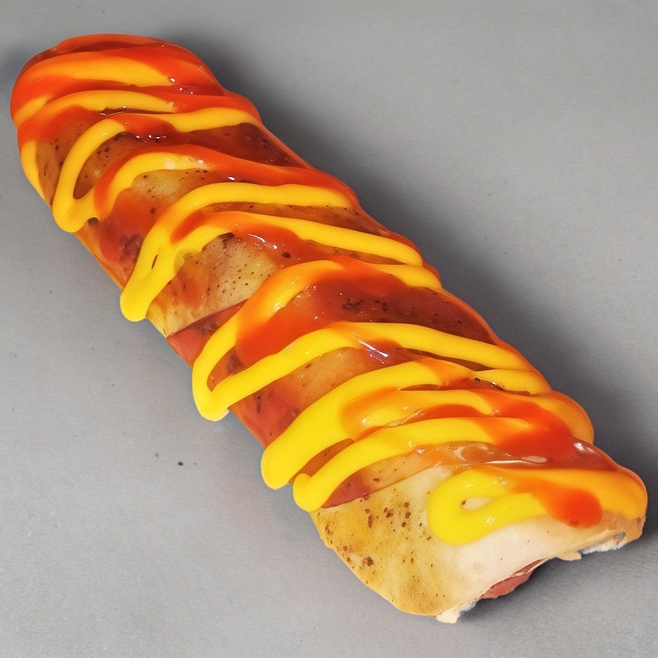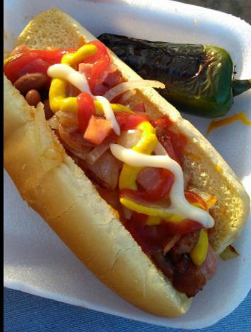 Medias Noches, salchicha de pavo, tocino, mayonesa, queso líquido amarillo, catsup, mostaza, cebolla caramelizada, queso de hebra, jitomate, piña y/ o champiñón (picante, macha, rajas o salsa de habanero).