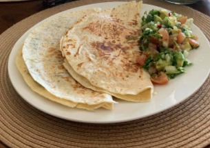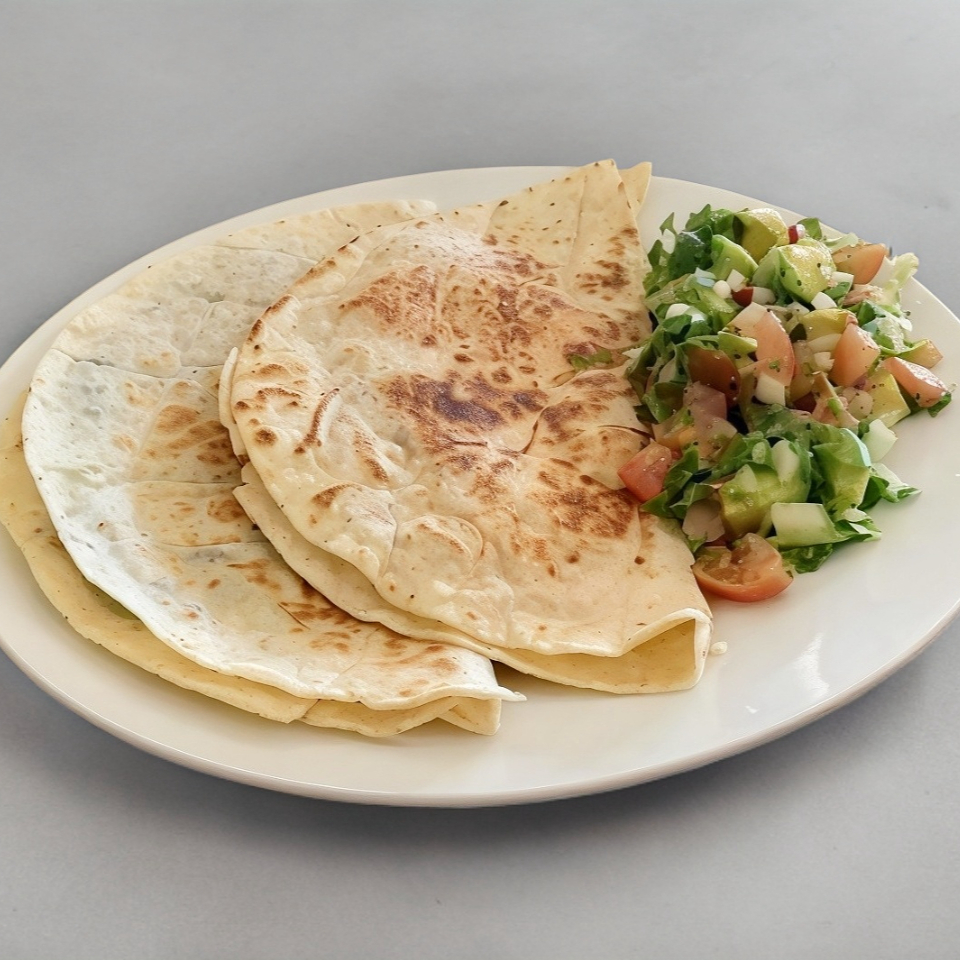 Tortilla de harina, queso cuadrado amarillo, queso manchego, jamón de pierna, queso de hebra, cebolla sazonada, piña o champiñón, (picantes: salsa macha, rajas o habanero).