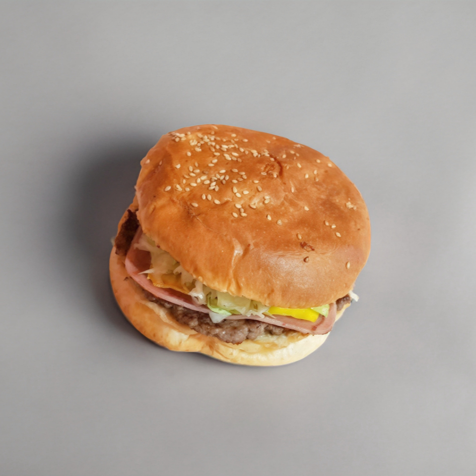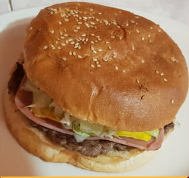 Pan brioche con ajonjolí, carne de res, queso americano, queso manchego, queso de hebra, tocino, cebolla frita, piña y/o champiñón, queso líquido amarillo, catsup, mostaza, mayonesa, picante a elegir, rajas o salsa de habanero.