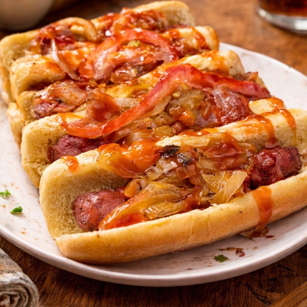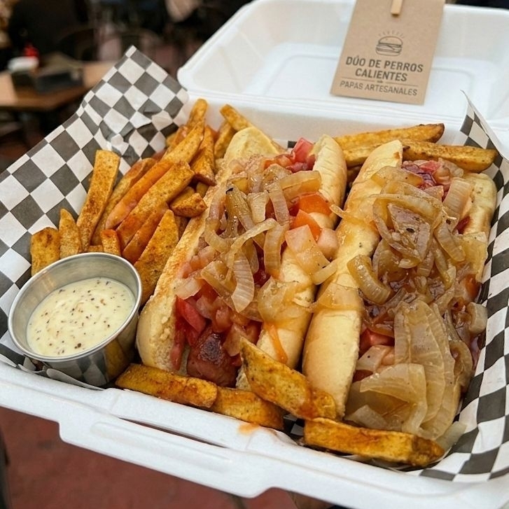 2 Hotdogs sencillos, capsut, cebolla carameliza, mayonesa tocino.
