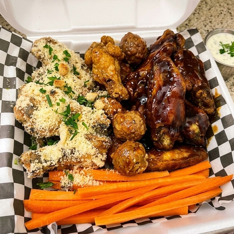 Orden de 10 alitas (5 bbq y 5 parmesano) con zanahoria y aderezo ranch
