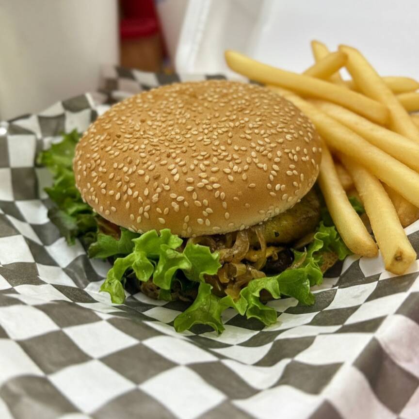 Carne, queso amarillo, lechuga, jitomate, cebolla caramelizada y catsup+ PORCION DE PAPAS