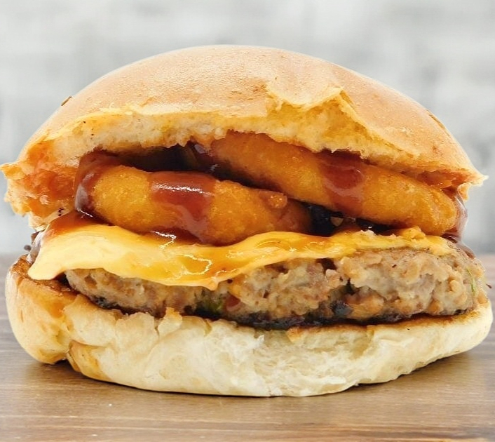 Hamburguesa con carne de res, queso americano, cátsup, mayonesa, mostaza, salsa bbq y aros de cebolla, 2 piezas.