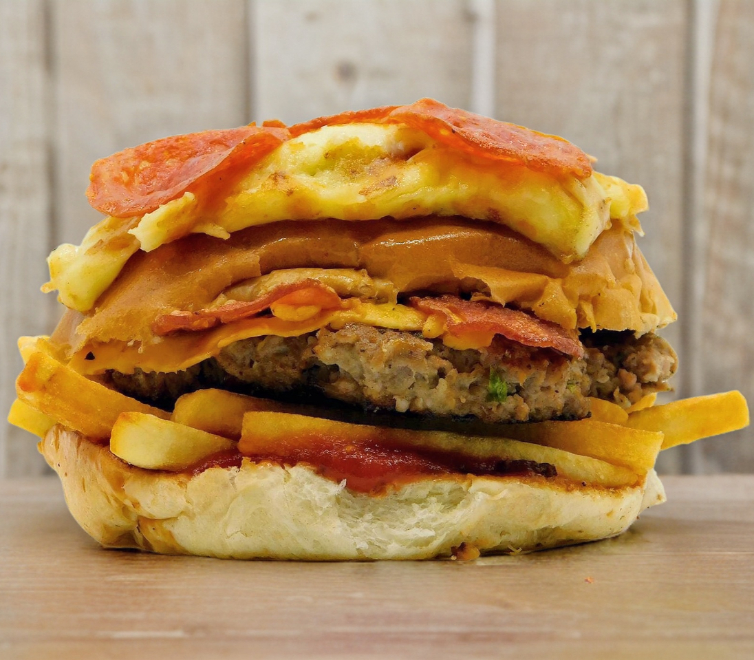 Hamburguesa con carne de res, 100 gr, queso americano, mozzarella, cátsup, mayonesa, mostaza, tocino, salsa de tomate, papas fritas y pepperoni.