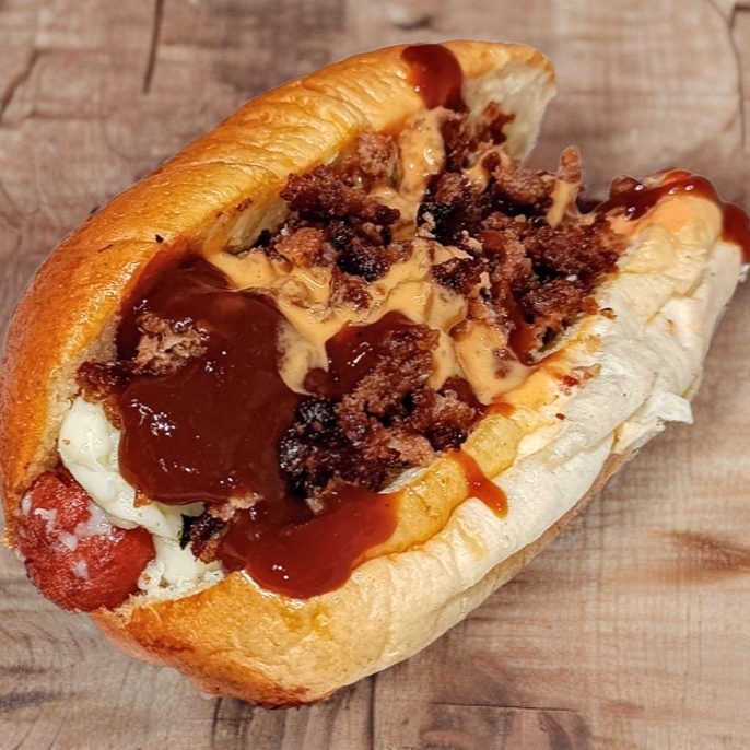 Salchicha de pavo, carne picada de hamburguesa, mayonesa, catsup, queso mozzarella más salsa bbq y chipotle cremoso.