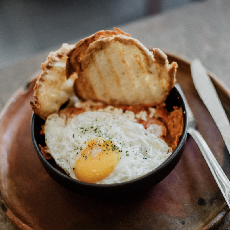 Pan artesano multigrano con aceite de ajo, queso gouda, queso fresco y queso Oaxaca; jitomate, espinaca. Acompañado de plátanos fritos.