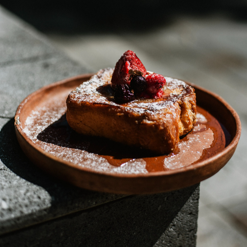 Pan brioche con una costra de azucar caramelizada, jarabe de lavanda y fruto rojos congelados.