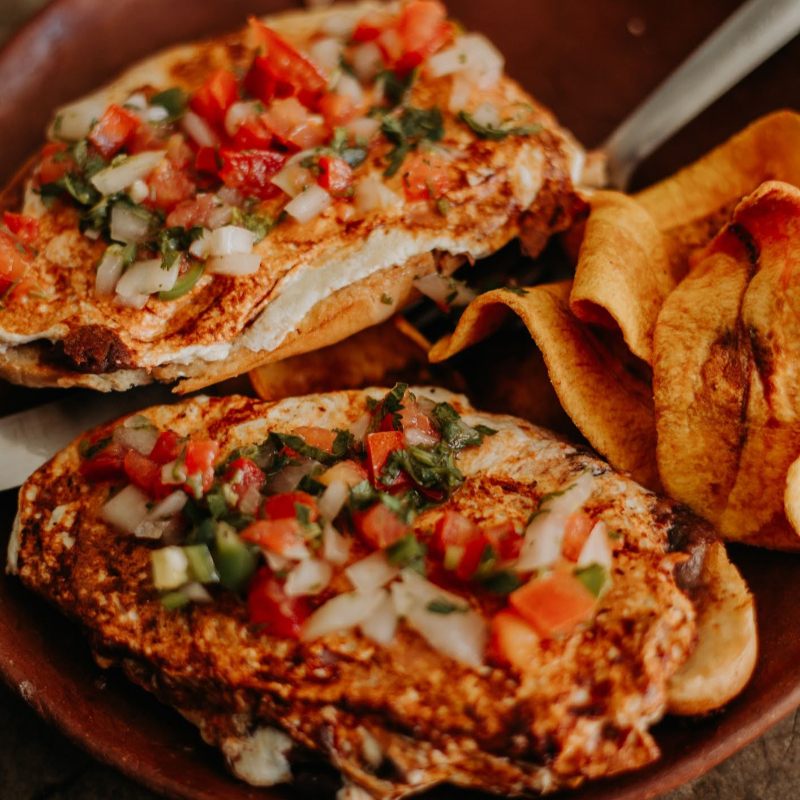 Bolillo con frijol y longaniza, costra de queso Oaxaca, jamón horneado de pavo y pico de gallo. Acompañado de plátanos fritos.